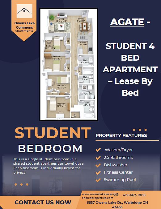 Welcome to Owens Lake Commons, located in Walbridge, OH a welcoming residential community offering both traditional full-home leasing and flexible private-bedroom living options. Our floor plans range from spacious 2-, 3-, and 4-bedroom apartments to large 4- and 5-bedroom townhomes, all in a beautiful neighborhood setting close to everything.