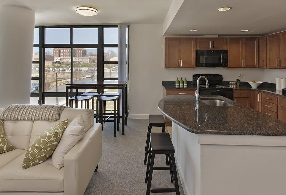 Floor-to-ceiling windowsGranite countertopsSpacious clubroomBlack energy star appliancesRoof terrace with seatingCeramic tile flooringViews of the capitol