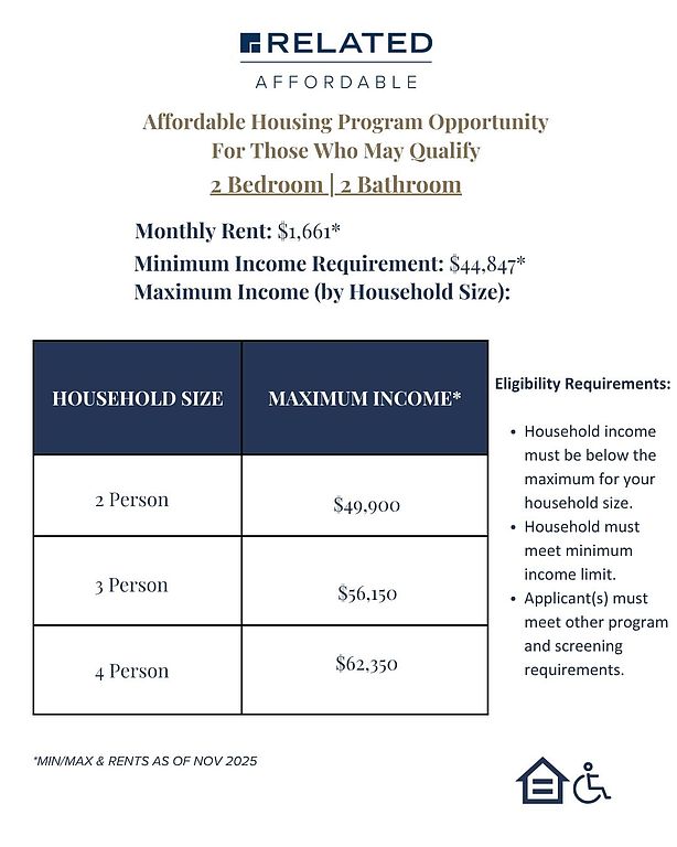 - Special offer! We have two income-restricted 2-Bedroom, 2-Bathroom apartments available soon! Minimum income to qualify is $44,847. The Maximum Income per household is 2 Person $49,900, 3 Person $56,150, 4 Person $62,350. Call today!