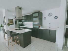 Consists of a Master Bedroom with a king size bed, walk-in closet and private bathroom with his and hers vanities and modern stylish shower; a Second Bedroom with a queen size bed; a Third Bedroom and an elegant height adjustable desk allowing comfortable work or study space. a second bathroom with a tub located in front of the second and third bedrooms, comfortable living and dining areas; a linen closet between the bedrooms; an enclosed comfortable functional laundry room with large capacity washer and drier, a sink and additional storage; a beautiful balcony view to the pool area; and an elegant kitchen with modern cabinets and a breakfast counter with stools.