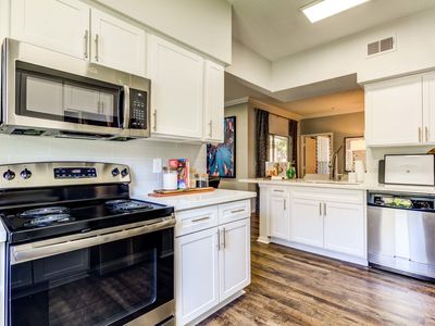 Natural lightModern kitchenOpen-concept designAmple storageSleek appliancesSpacious backyardPrivate backyard