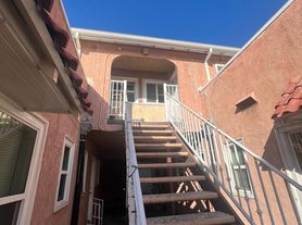 Second-floor apartment with 2 bedrooms and 1 bathroom, featuring vinyl flooring throughout the unit. The kitchen includes a gas stove. The bathroom is located in the hallway. Wall heater.