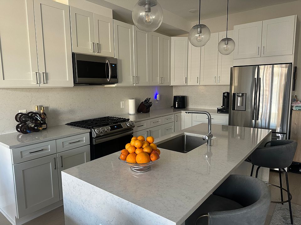 Modern Kitchen: Equipped with updated appliances, marble tops, and plenty of counter space and storage, perfect for cooking and entertaining.