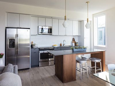 Convenient half-bath downstairsPrivate entrancePrivate patioDark cabinetryModern flooringAmple storage