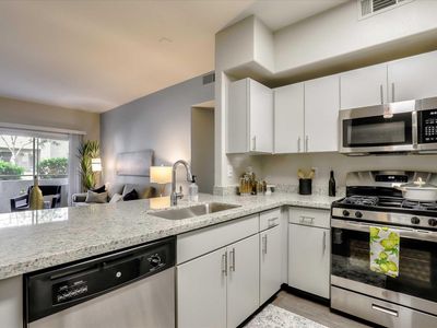 2 beds, 2.5 baths, 2 car garage, open kitchen w/ GE*stainless steel appliance package, white cabinets w/ slim profile pulls, white quartz counters, custom tile backsplash, european kitchen & bath fixtures, color changing under cabinet LED lights, walk-in pantry, modern ceiling fans & accent wall panels, spacious living & dining room w/ covered balcony, 3 TV's included, guest bathroom w/ floating vanity, luxury wood plank floors throughout, upgraded baseboards & casings, built-in shoe rack at main entrance, primary bedroom w/ custom walk-in closet, ensuite bathroom w/ dual sinks, rotating pull faucets & shower enclosure, laundry room w/ LG* washer/dryer & storage shelves, garage w/ epoxy floor & storage racks, tankless water heater & water softener, Nest* thermostat, Ring* doorbell, smart lock keyless entry, gated community w/ pool/spa, play park, picnic/bbq areas. NO PETS, NO SMOKING.