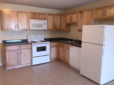 KITCHEN: Large eat in kitchen includes new granite countertops throughout, new large sink & faucet, freshly painted kitchen cabinets with new nickel hardware, and new linoleum flooring. In-unit refrigerator and oven/cook top stove.