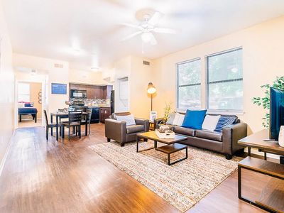 This up-scale 2-bedroom, 2-bathroom apartment is centrally located in downtown San Marcos, offering a unique blend of modern design and vibrant city energy. Start your mornings with coffee or wind down in the evening on your private balcony overlooking LBJ Drive. The apartment's high ceilings and three expansive windows welcome in natural light, creating a bright and inviting space. Steps from Texas State University, and a short stroll to local restaurants, trendy boutiques, and exciting entertainment, this apartment places everything San Marcos has to offer right at your doorstep. With the convenience of a washer and dryer, included water and trash services, and two dedicated parking spaces, you'll experience effortless downtown living. Don't miss out on this exceptional opportunity schedule a showing today to see firsthand the charm San Marcos has to offer!