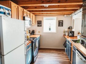 Large showerFully equipped kitchenLinens includedTwo level garage apartmentTwo full bedsKing bed