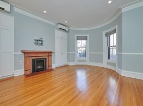 The fully renovated condominium rental features hardwood floors throughout, extra-high ceilings, oversized windows and period moldings. A parlor-level entry leads into a spacious living/dining area with a gas fireplace and flanked by custom built-ins with additional storage compartments. The adjoining kitchen offers a contemporary decor with stone counters, stainless appliances, exposed brick, custom light fixtures and abundant cabinet & pantry space.