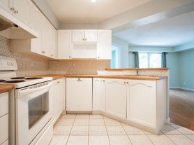 Tuck's Forest beckons! Embrace tranquil, carpet-free living in this beautifully maintained 2-storey townhouse backing onto a private, lush greenbelt. This home features an open-concept main floor designed for gatherings, anchored by a spacious kitchen boasting maple cabinetry, gleaming quartz countertops, a breakfast bar, and a sunny eat-in area with a charming bow window. Entertain seamlessly in the living room, which offers durable laminate floors, a cozy stone gas fireplace, and a walk-out balcony overlooking the peaceful yard. Upstairs, two airy bedrooms with soaring vaulted ceilings await, alongside a refreshed 4-piece bath and the convenience of upper-level laundry. The walk-out recreation room on the ground level is flooded with natural light, offering a secondary 3-piece bath and direct patio access to the fenced yard-perfect for summer BBQs. This property includes a single-car garage plus driveway parking for a total of two spaces. Located in the family-friendly Palmer community, you are steps away from public transit, recreation centers, parks, and top-rated schools. Enjoy easy access to the QEW and 407 for effortless commuting. Please note: There is no carpet in the entire house-ideal for easy maintenance and allergy-sensitive tenants. New professional photos showcasing the brand-new flooring in both bedrooms will be posted soon!