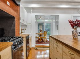 The living area exudes warmth and character with its exposed brick and beams, seamlessly merging historic detail with contemporary elegance. The open-concept, eat-in kitchen is a chef's delight-featuring brand-new appliances, butcher-block countertops, center island, and abundant cabinetry for effortless organization. Adjacent to the kitchen, the dining room overlooks the lush garden and offers flexibility to serve as a home office or creative space.