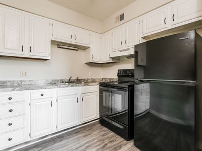One and one/half baths; two bedrooms each with double closets; laundry room; kitchen with stove, refrigerator and dishwasher. One car garage and private backyard.