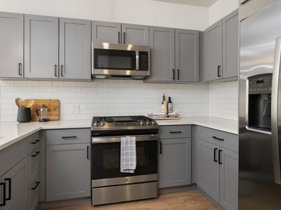 Newly designed kitchenModern appliancesWood floorsBackyard perfect for relaxation