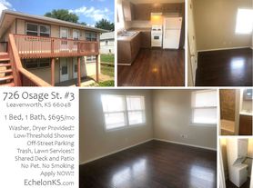 One Bed, 1 Bath Apartment on the Deck Level!! Washer and Dryer PROVIDED!! Kitchen with Dining Nook!! Low-Threshold Shower. Off-Street Parking. Shared Deck and Patio. Trash and Lawn Services Provided!! No Pets. No Smoking. Minutes away from Downtown Leavenworth, Lansing, and the Greater Kansas City Area!!
