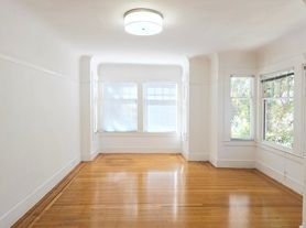 A large one-bedroom apartment with good light and located on a slow street. Hardwood floors with inlay. A large living room (10x15ft) with two four-way bay windows, closet and French doors separating a fireplace area from the dining room which has a raised platform below a four-way bay window and two built-in shelves. Bedroom with closet.