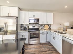 Open floor planModern cabinetry in kitchenStainless steel appliances