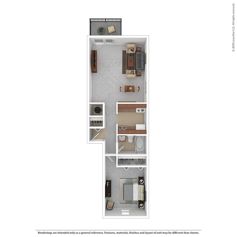 Private patio or balconyEfficient galley style kitchensCozy bedroom