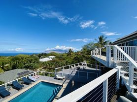 This newly remodeled, fully furnished 6-bedroom, 5-bathroom home in Maui Meadows offers sweeping ocean views, modern amenities, and relaxed island living. Just minutes from the white sand beaches of Kihei and Wailea, the home sits on a private lot with a saltwater pool, spa, and a fenced yard with mature fruit trees. With approx. 4,500 sq ft of interior space, it features cathedral ceilings, an open floor plan, and walnut wood floors across two levels. Large sliding glass doors connect the living areas to covered patios and decks with 180-degree ocean and sunset views. The kitchen includes stainless-steel appliances, a center island, and a breakfast nook. A media room features a 75-inch flat screen TV, and the spacious living room flows into the kitchen and outdoor areas for easy entertaining. Most rooms have ensuite bathrooms, ample closets, workspaces, and smart TVs. Each bedroom includes a queen or king bed, except one with a daybed that converts to two twins. The pool cabana has it's own ensuite bathroom, kitchenette, and full size linen sofa bed. This well-designed home blends indoor-outdoor living, privacy, and convenience in a sought-after location.