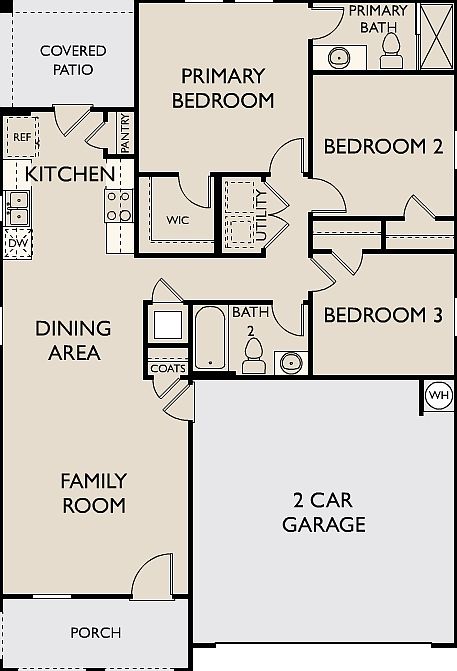 Enter through the front porch into a spacious main living area that includes the family room, dining area, and kitchen. A coat closet and access to the two-car garage are located off the family room, while a covered patio extends from the kitchen for easy outdoor living. Just beyond the kitchen and dining area, you'll find the primary bedroom with a primary bath and walk-in closet. Two additional bedrooms share a full bath nearby, and the laundry room is centrally located for convenience.