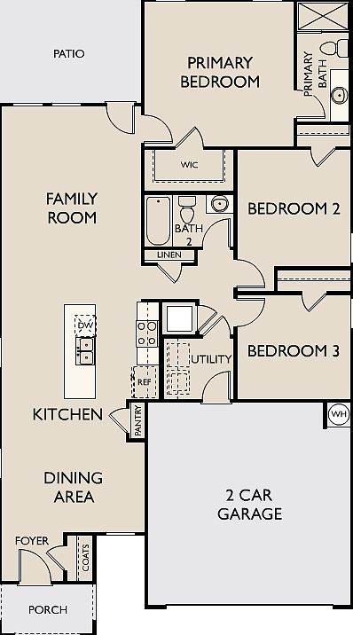 Welcome to your next home! As you enter from the porch into the foyer, you're immediately greeted by the open dining area, kitchen, and family room. Just off the family room, you'll find a spacious back patio. On the opposite side of the kitchen and family room are two additional bedrooms that share a bath, along with a laundry room that provides access to the two-car garage. At the far end of the family room is the primary bedroom, complete with a walk-in closet and private primary bath.