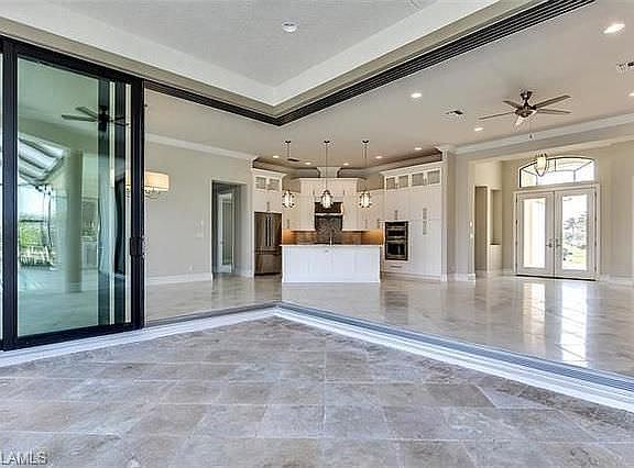 Oversized island barHigh ceilingsWalls of glassSpacious open floor planSliding glass doors