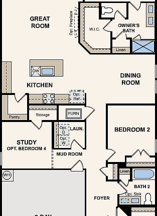 The open layout at the heart of the Heron showcases a sunlit, spacious great room, a dining area, and an impressive kitchen with a walk-in pantry and a center island. The serene primary suite is adjacent, offering a restful retreat at the end of hectic days. Enjoy a walk-in closet and an attached bath with dual sinks and a walk-in shower. Toward the front of the home, you'll find a private study and two bedrooms flanking a full bath. A central laundry adds convenience. Options Include: Covered patio Sliding glass door to access patio Soaking tub and shower at primary bath Tub with shower at primary bath Bedroom 4 in lieu of study