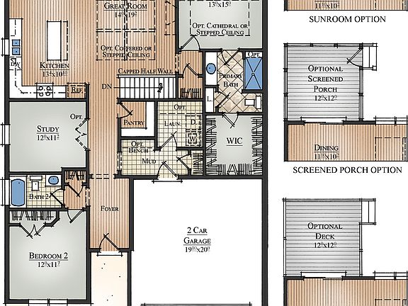 A private alcove off the great room lends privacy to the primary bedroom suite which includes the option for a stepped or cathedral ceiling. The primary bath features quartz countertops and entry to a spacious walk-in closet. A mudroom and laundry Room are conveniently located off a 2-car garage.