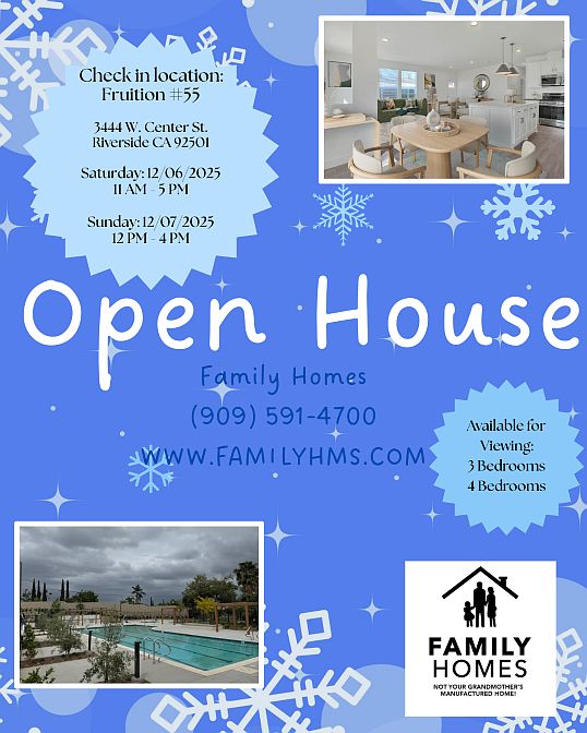 FRUITION......The first brand new manufactured home community in Southern California in the last 31 years. The fantastic home site includes security gates, playground for the children, dog park, and a magnificent pool/recreational area that every family is going to love. Our homes are second to none! 6-inch walls filled with insulation, dual pane windows, state of the art appliances, plank flooring, quartz countertops, that's just to name a few of our great features. Our clients are telling us that their total payments are equal to or less than what they were currently paying for rent and now the home is theirs. Take advantage of introductory pricing that definitely won't last long. Once you visit Fruition by Family Homes, you will know why these are not your grandmother's manufactured homes!