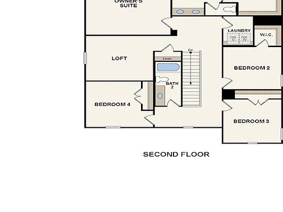 The Jordan is a beautiful home you will surely fall in love with. As you step inside from a spacious front porch, you will be greeted by a formal dining room, a large living area, and a well-equipped kitchen with a charming breakfast nook and a spacious center island. The main floor also features a versatile study. On the second floor, you will find three gracious secondary bedrooms, one of which has its own walk-in closet, a full hall bath, an expansive loft, and a convenient laundry room. The second floor is completed by an elegant owner's suite with a private bath with dual vanities, a walk-in shower, and an immense walk-in closet. Options may include: Additional secondary bedroom upstairs Bedroom and full bath in place of study Loft