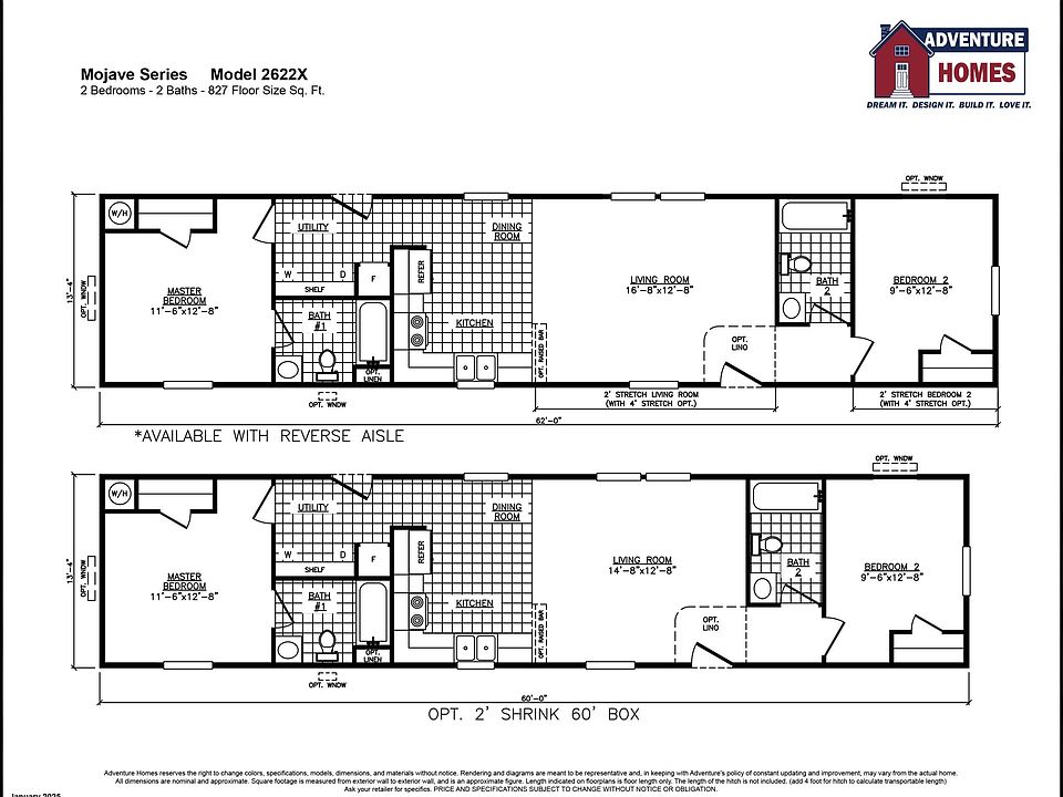 The Mojave 2622X by Adventure is a 2-bedroom, 2-bath home that blends modern comfort with practical design. Its open layout offers inviting living and dining areas, while both bedrooms are thoughtfully sized for relaxation and convenience. With two full baths and a functional flow throughout, this plan is designed to provide an easy, comfortable lifestyle.