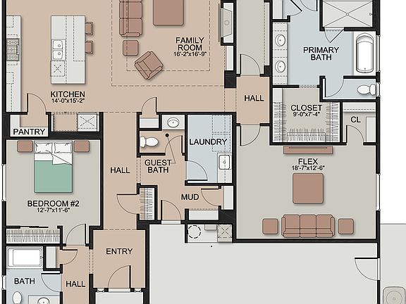 The Weston is a single-level home offering a flexible layout to meet your needs. The private hallway leading to the primary suite ensures a peaceful retreat, while the flex room can be used as a fourth bedroom or office. The kitchen features open shelving for a modern touch, and the large covered patio provides the perfect space for outdoor living. A convenient laundry room sink adds practicality to this thoughtful design.