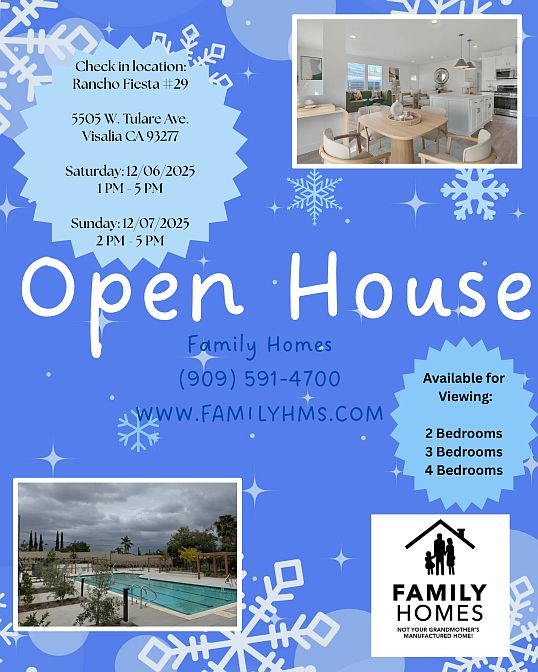 Phase 1 is sold out! Ranch Fiesta in Visalia by Family Homes is proud to announce the Grand Opening of Phase 2. Each customer will have the opportunity to choose between 6 floor plans, 2, 3 and 4 bedrooms. You are going to make all the decisions as fas as exterior color, cabinets color, countertop colors, etc. All of our lots are oversized allowing family the opportunity for a lot of outdoor space, and yes you can fence it all in. With prices starting at only $142,995 we have clients putting as little as 5% down and having total monthly payments $1739 per month (that is both the bank payment and land lease combined). If that's not enough, we have two pools, a huge clubhouse with indoor Jacuzzi, full court basketball, and too many other amenities to list. For the same price that you're paying for your two bedroom apartment stacked on top of one another, you could be having your own detached manufactured home and start living the lifestyle that you deserve. Only a few opportunities left. Don't let this slip through your fingers. Go to our website today for all the information at familyhms.com. Remember these are not your grandmother's manufactured homes.