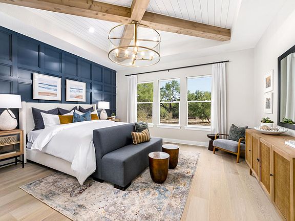 The Blanton's inviting porch and welcoming foyer reveal the spacious great room and bright casual dining area, with views to the desirable large covered patio beyond. The well-appointed kitchen is complete with a large center island with breakfast bar, plenty of counter and cabinet space, thoughtful workspace, and sizable walk-in pantry. The elegant primary bedroom suite is highlighted by a lovely tray ceiling, enormous walk-in closet, and spa-like primary bath with dual vanities, large luxe shower with seat, and private water closet. Secondary bedrooms feature ample closets and shared hall bath with dual-sink vanity. Additional highlights include a secluded flex room with tray ceiling, convenient powder room and everyday entry, centrally located laundry, and additional storage.