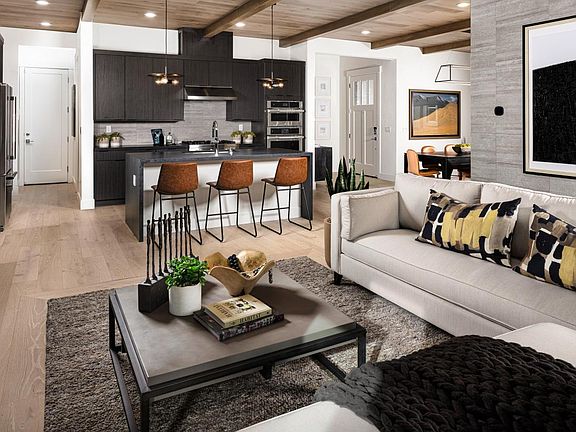 The Colby's warmly inviting foyer opens onto a wide-open living space with bright casual dining area, spacious great room, and views to the desirable rear covered patio. The well-designed kitchen s large center island overlooks the open floor plan and is perfect for entertaining with plenty of counter and cabinet space and a generous walk-in pantry. The private primary bedroom suite is complete with an ample walk-in closet and relaxing primary bath with dual-sink vanity, large luxe shower with seat, and private water closet. The secondary bedroom features a sizable closet and shared hall bath. Additional highlights include a convenient everyday entry and drop zone, centrally located laundry, and versatile workspace.