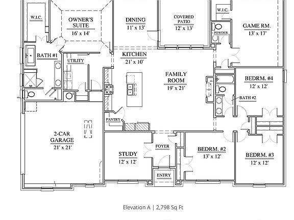 The Camden floor plan packs a lot into 2800 square feet. The open kitchen and family room are the central area of this single story home. This home also features four bedrooms, 2 1/2 bathrooms, a private study, and a game room which can be converted into a fifth bedroom with a 3rd full bathroom.