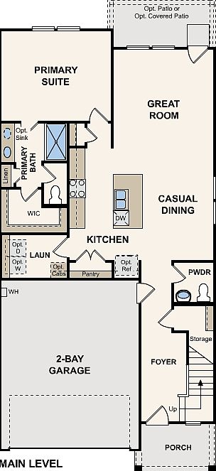 The open-concept design of the two-story Lexington floor plan shows the huge island kitchen connected to the great room and dining room. The open-feel of the home is popular with today's sophisticated buyer, who is looking for a design that fosters togetherness in the home and makes entertaining fun. The use of space in the Lexington is well thought out, with the primary suite privately situated on the first floor, while the secondary bedrooms are on the second floor.