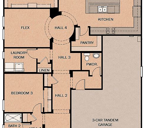 The Pine Ridge is the largest single level home at 2383 square feet. It features 3 bedrooms,flex room, 2 1/2 baths, a covered patio and a 3 car garage. It can accommodate a 4th and fifth bedroom, a dining room, or a home office. HERS 39