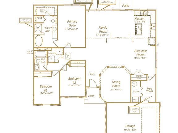 Ranch-style homePrimary suitePrivate bathDecorative columnsFamily roomAdditional bedroomsDining room
