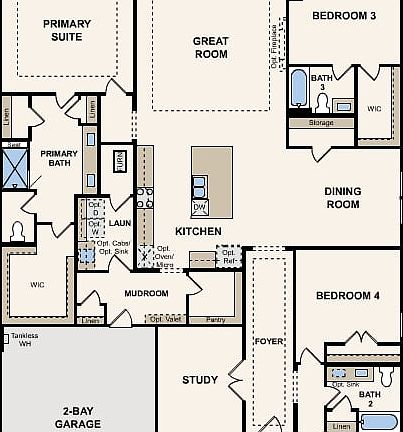 The desirable Bradbury single-level floor plan offers an expansive living space, centered around an airy great room with quick access to the well-equipped kitchen, complete with center island and comfortable dining room. The floorplan features a luxurious primary suite, complete with walk-in shower, dual vanities, and a spacious walk-in closet. Three more bedrooms and a study round out the floorplan. Options include a covered patio and a primary suite bathtub to accompany the shower.