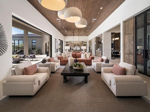 The elegant Sunburst exemplifies luxury single-story living at its finest. An airy foyer flows past a spacious office and flex room into breathtaking main living area with a casual dining area, sophisticated great room, and access to an expansive covered patio. Adjacent, the well-designed kitchen is enhanced by dual center islands, including one with a breakfast bar; a large prep kitchen area; plenty of counter and cabinet space; and a generous walk-in pantry. The impressive primary bedroom suite is complete with a palatial walk-in closet and a marvelous primary bath with dual vanities, a large soaking tub, a luxe shower with seat, and a private water closet. Secondary bedrooms feature walk-in closets and private baths. Additional highlights include easily accessible laundry, a powder room, an everyday entry with drop zone, and plenty of additional storage.
