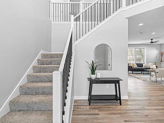 Our clients love the covered wrap-around porch in the front of the home as well as a screened-in porch that opens to a deck in the back. The open concept design begins in the two-story front foyer and flows into the great room, through the kitchen—which features a kitchen island—and ends in the radiant sunroom. The garage, which includes three individual stalls, directly connects to the mudroom and washroom, making it easy to keep the mess of everyday life hidden away from the main areas of the home. Upstairs you will find four bedrooms—one of which includes the primary bedroom—and a spacious laundry room. With a double vanity in both the primary and hall bathrooms, fighting over bathroom time will be a thing of the past. Spacious closets in all of the four bedrooms give you plenty of space to store clothing, shoes, and other accessories. While the original design has stone and shake siding on the outside, homebuilders have a selection of exteriors to choose from.