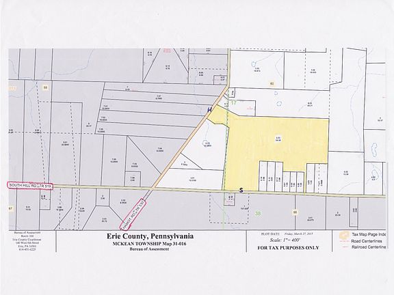 54.0800 acres of vacant land located in McKean Township. The land is located just off of the corner of Hamot Rd and South Hill Rd. The land can be seen on the map in image #2, it is highlighted in yellow; you can also get a general idea of the land on the Google view in image #3, the parcel does include some of the treed/wooded area to the far right. There is frontage/access to the land via Hamot Rd and South Hill Rd as seen on the map; approximate frontage on Hamot Rd is 300 ft, approximate frontage on South Hill Rd is 750 ft. Image #4 is a view taken from the street at the Hamot Rd frontage (marked H on map in image #2). Image #5, 6, & 7 are views taken from the street at the South Hill Rd frontage (marked S on map in image #2). Property is zoned A-1 Conservation. Property qualifies for McKean Township LERTA. If interested please email codyfluff2010@gmail.com or text/call 814-823-3289