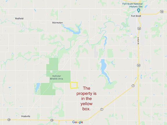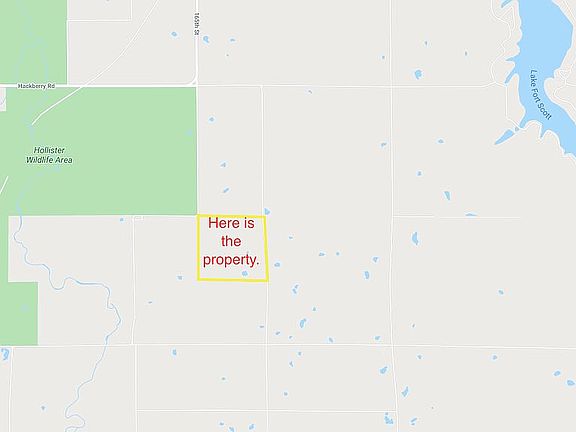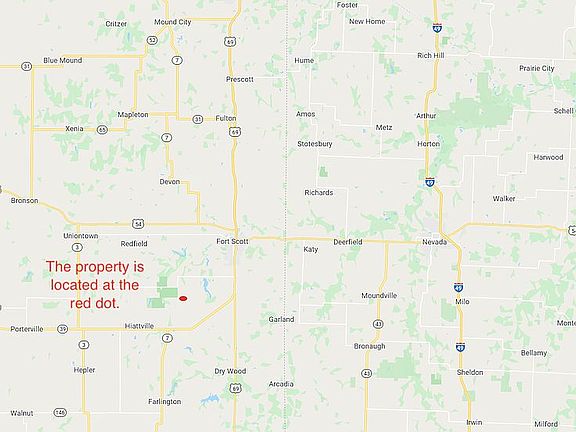 160 acres. 80 acres of cropland. 80 acres of pastureland. 2 ponds. Some timber. Fenced all the way around. Great view up on a hill of the countryside. No leases on the land currently. Great hunting as it is close to Hollister wildlife preserve. Only about 1 or 2 miles on gravel road, otherwise paved. Make an offer! Driving directions: From Hwy 69 go west on Indian road. Pass lake on left, Pass airport on right. Pass bait store on left. Follow pavement when Indian road bends south, now you are on 165th st. Keep going south. Then turn left (East) on Hackberry Rd. (Gravel) Take first right on 170th st. Go about .75 miles and the property is on right. There is a fence on north side between field and crop land. Gate there and go further on 170th at top of hill gate to pasture.