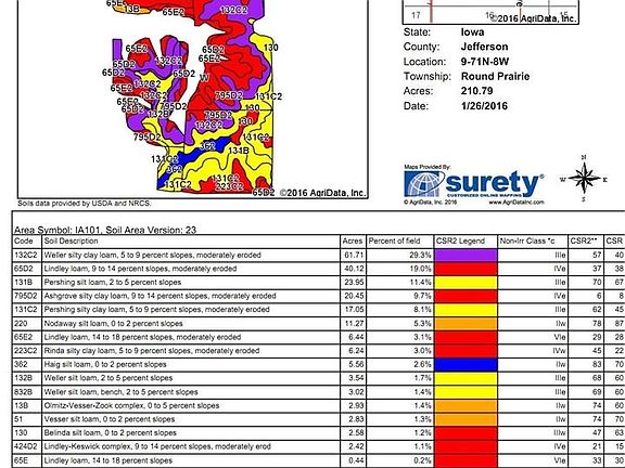 285.49 Acres total with 210.79 Acres Tillable with average CSR2 rating of 50.7. Current owner would sign 5 year contract to rent for $200/acre or $42,158 per year Which is 3.7% ROI at asking price. There is a current CRP estimate for 191.66 acre to be enrolled at $238.8/acre or $45,771 which would be 4.0% ROI at Asking Price. Seller would enroll with signed purchase agreement. CRP numbers are subject to change and enrollment availability at time of purchase.