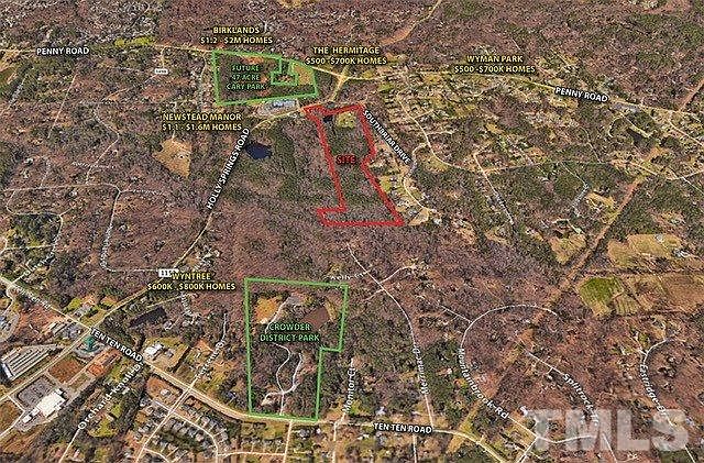 Approximately 41.6 acres located at the intersection of Holly Springs Road and Penny Road near the proposed 40 acre Cary Park. This property is one of the last remaining large land tracts available off Holly Springs Road. Primed for estate home development , surrounded by high-end neighborhoods and two parks. Property is zoned R-40W, with no city taxes. Owner has done soils reports. Horse allowed. Call for more info.