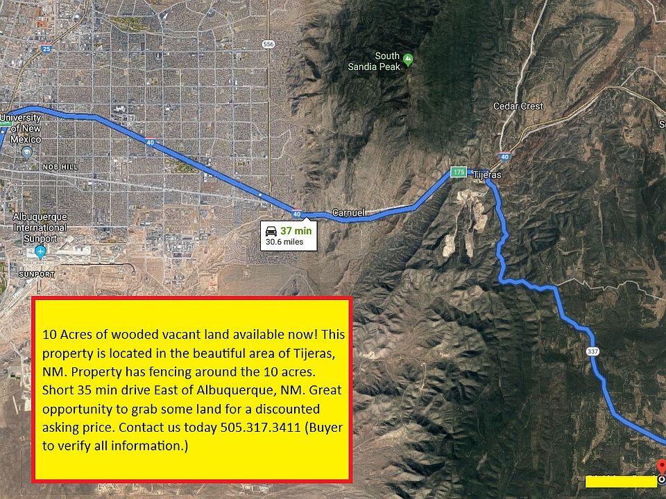 We have a beautiful 10 acre parcel located in Tijeras, NM available now. 10 acres of wooded land, property is fenced in and there are no utilities on the property but in the area. Road access to property. (buyer(s) to verify all information) Utilities: None Area Description: Property is located approximately 30 min from Albuquerque, NM. Local shopping, groceries and other amenities nearby. Directions: Property is located off interstate 40 and State Rd 337, property can be found through Google maps giving precise directions. Price: Asking $54.5k, open to offers. Awesome opportunity to own 10 acres located in Tijeras, NM. Homes are already in the area. Great price for many acres. Contact us today 505.317.3411 (buyer(s) to verify all information) Agent Connect Realty