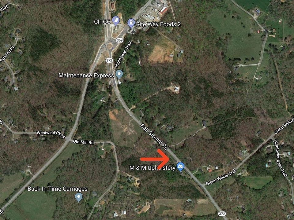 Level 1.2 acre lot on Ball Ground Road (372) near new roundabout at 369. Currently zoned Agricultural. Potential for prime commercial location in fast growing Ball Ground, GA with low Cherokee county taxes. Property has been used for antique car business. 1000 sq ft. cinder block building near rear of property. Use as is or clear and build. Property could also be used for a live/ work site. Next Door to M&M Upholstery 6651 Ball Ground Rd.