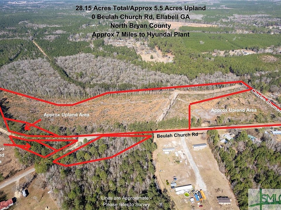 28.15 Acres Total with approx 5.5 acres Upland on Beulah Church Rd at Charles Shuman Rd in North Bryan County, Ellabell GA. Approx 7 Miles from the new Hyundai Meta Plant. This Residential Tract has several access Roads (Hwy 280/Hwy 204/Hwy 67) and has approx 1,402' Road Frontage on Beulah Church and approx 450' Road Frontage on the paved Charles Shuman Rd. Currently Zoned RR-1. This Zoning allows for 1 Acre Lots w/ a minimum of 100' Road Frontage. Wetland Delineation Report attached.
