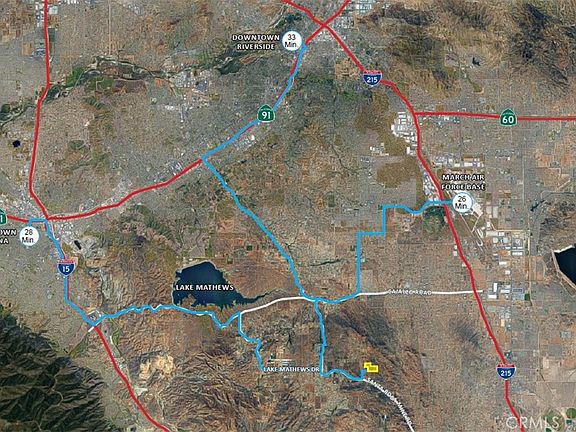 The subject property consists of four parcels totaling approximately 98 acres of land within the Lake Matthews area in Riverside County. Three of the four parcels have frontage on Blue Sky Road and form a rectangular shape measuring approximately 2,500 feet in width and 1,200 feet in length. The fourth parcel is connected to parcel #321-210-052 to its northwest via Celestial Drive. The property itself has mild topography on the frontage portion along Blue Sky Road and leads into hillside towards the northwestern most parcel. The area surrounding the property consists of mostly rural residential/large lot homes and some agricultural operations. The property lies approximately 4.5 miles from Highway 74 access which connects to the I-215 to the north and the I-15 to the south.