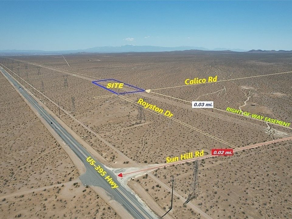US-395 Right-of- way investment potential! This property is located approximately 700 ft west of US-395 Hwy and 0.5-mile dirt road access to the property, only 2 miles North of Shadow Mountain Rd - (The Main entrance road to the Silver Lakes area in Helendale, CA) at US-395 Hwy. Here you can build Single-Family home and explore other possibilities. Many properties sold in the last 2 years, this one is available for the right price. Adelanto, CA is growing and the leader in the High Desert in Cannabis distribution centers among other industrial sectors. Google maps cordinates for the location of the property are: (34.750472 -117.473850). Buyer to complete own due diligence investigation regarding, but not limited to, on zoning, utilities and building restrictions. Please note, the boundaries represented in the photos are a close estimation of the property lines and do not show exact property boundaries.